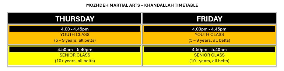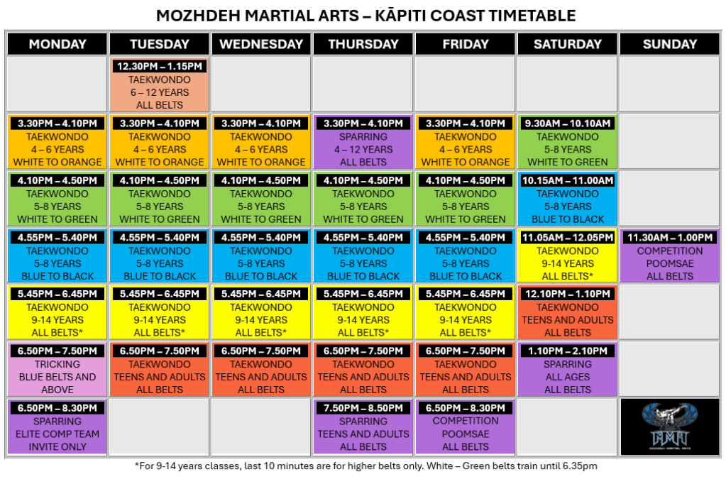 For sparring and poomsae classes, athletes are expected to be warmed up and in full gear before the class starts.